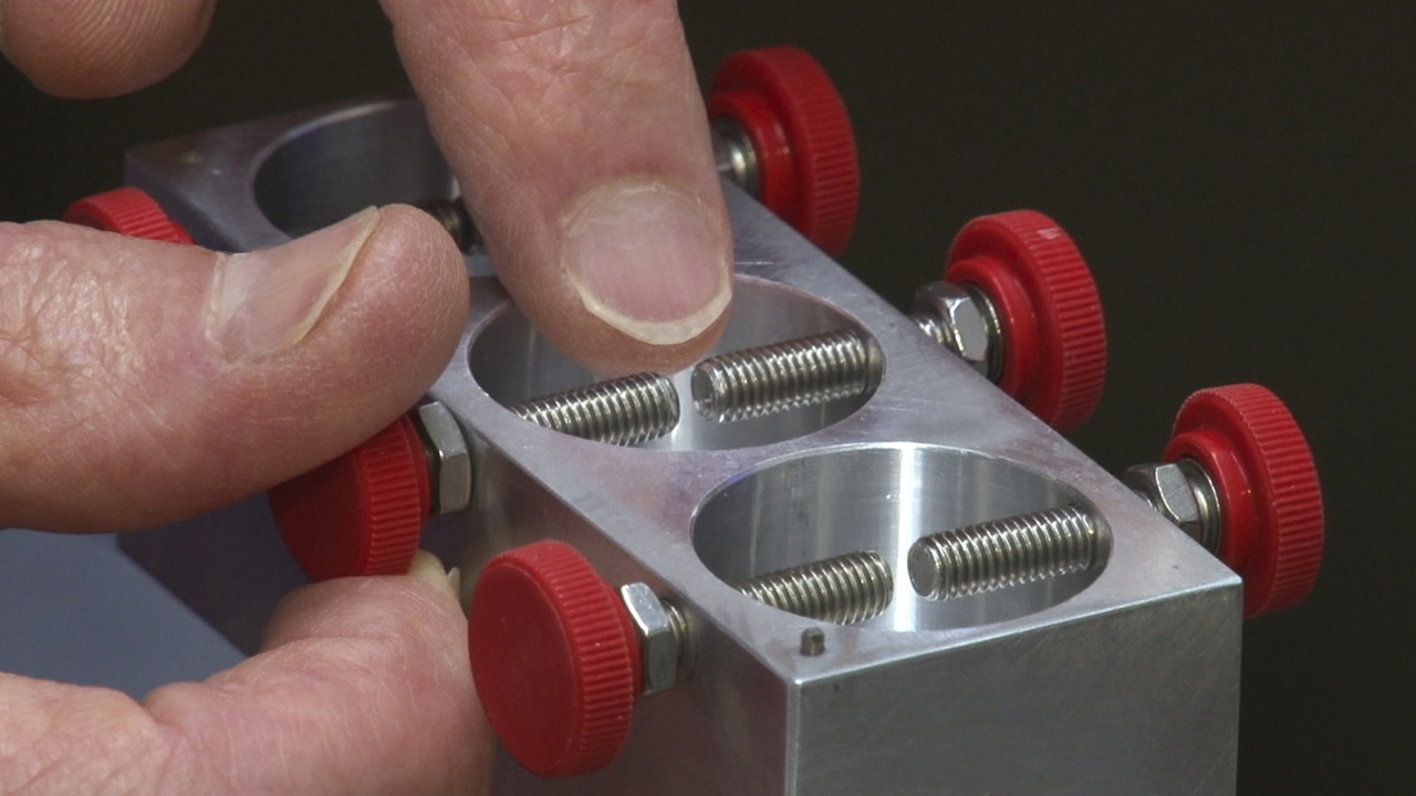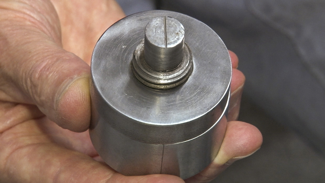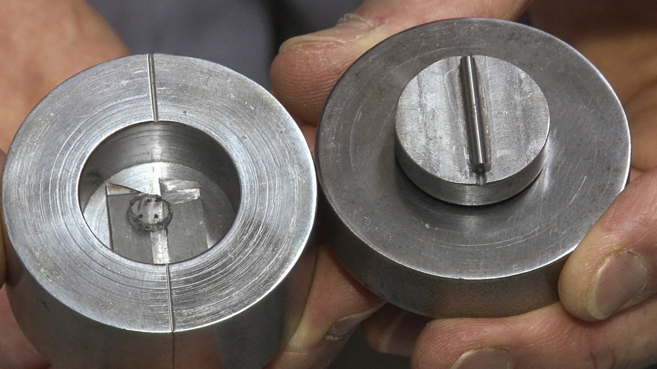 On the inside of the cylinder’s lid, there’s a tungsten carbide rod bonded to the surface. Grooves inscribed on the cylinder base and the side of the lid help Shirey align it so that the rod is directly parallel and above the gap between the two tungsten carbide lathe bits in the cylinder base.