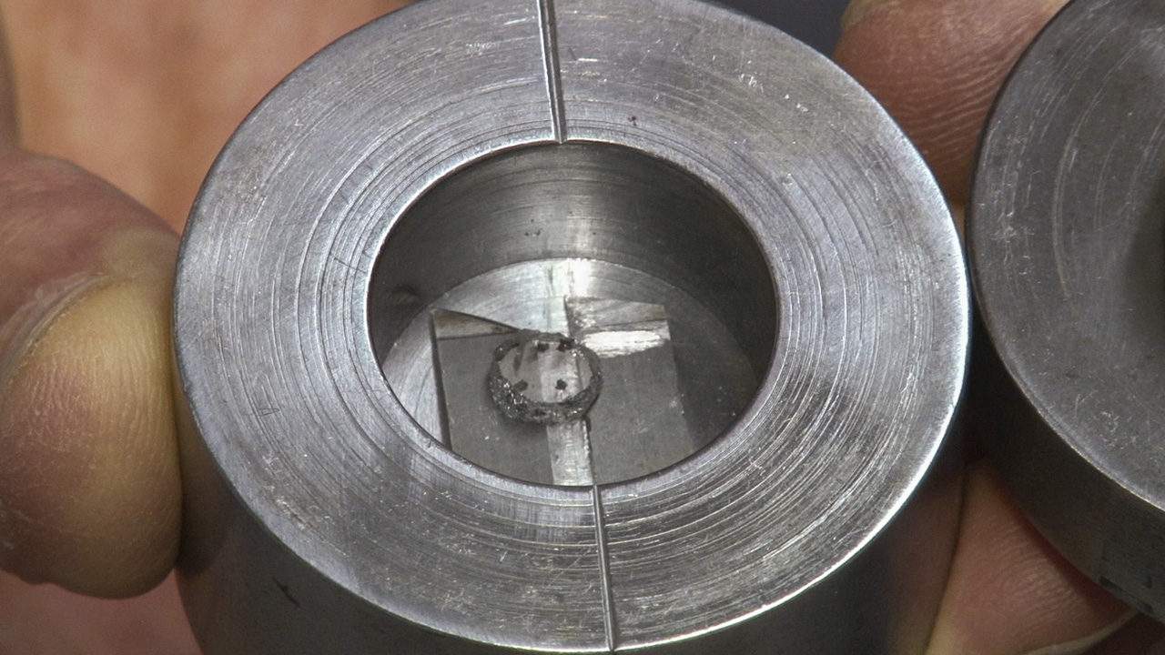 Shirey adjusts the piston in the lid so that there’s just enough play to contact the diamond without crushing it. A sharp tap on the top of the piston with a small hammer cleaves the diamond in the plane of the sulfide inclusion, releasing it.