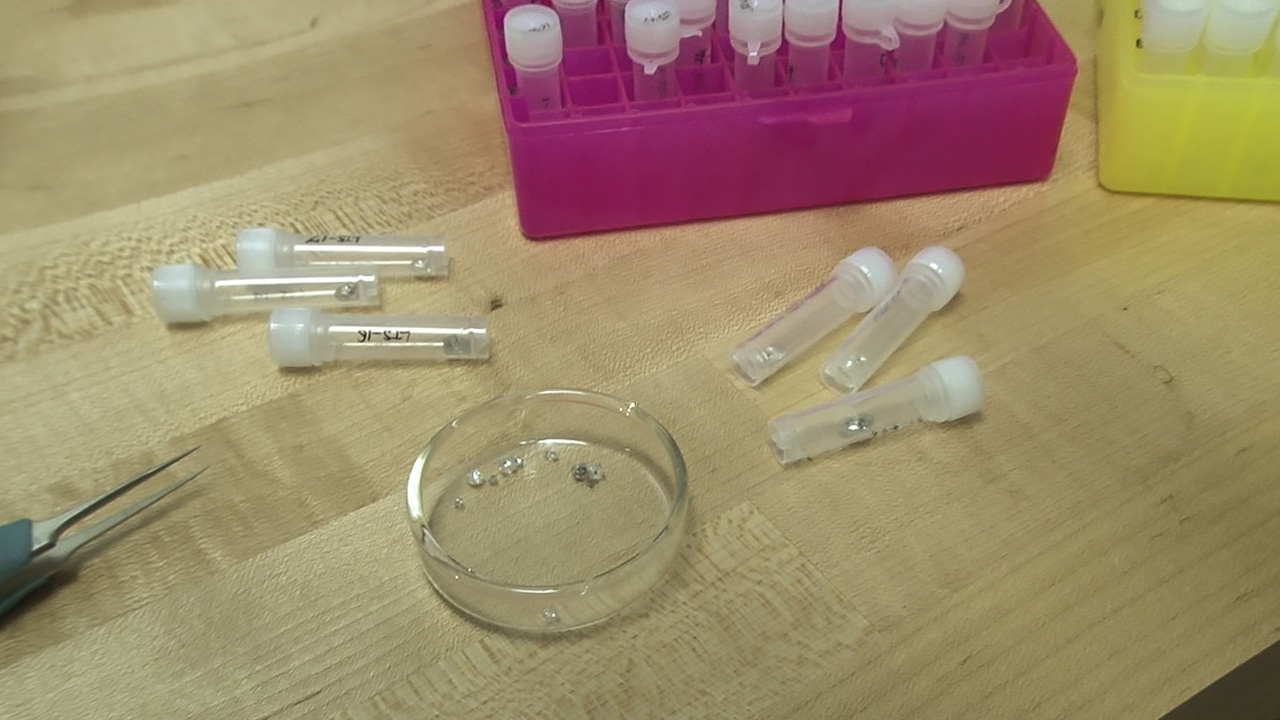 His next step is to wash and rinse the inclusion with ethanol in a tiny beaker, in preparation for weighing it in an extremely sensitive electronic balance. He then carefully picks up the inclusion with a needle and transfers it to a little foil weighing boat that itself weighs a fraction of a milligram.