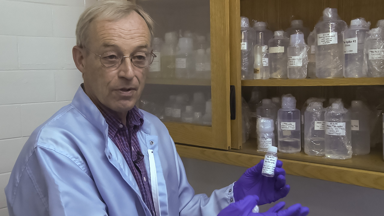 Shirey then takes the rhenium from the column and dries it down to prepare it for analysis. Now that the osmium and rhenium are separated, he can begin the final part of the process, which is to run both on sophisticated laboratory instruments called mass spectrometers. To avoid any cross contamination, each metal is run on a separate instrument, which counts the different isotopes—or masses—of each element. Shirey tells us, with something akin to relief, “From that we have the isotopic composition, and we can calculate the age…and that’s the end of the work.”