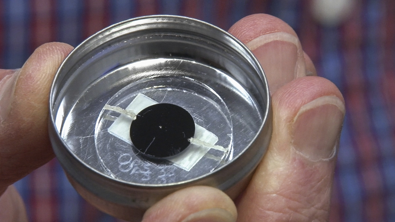 The tiny reflective speck at the center of the black disk is a sulfide inclusion, which has been cleaved out of a diamond plate using the “diamond cracker.” Hidden inside this tiny speck are traces of the rare elements rhenium and osmium. Pedro Padua © GIA, courtesy Carnegie Institution of Washington