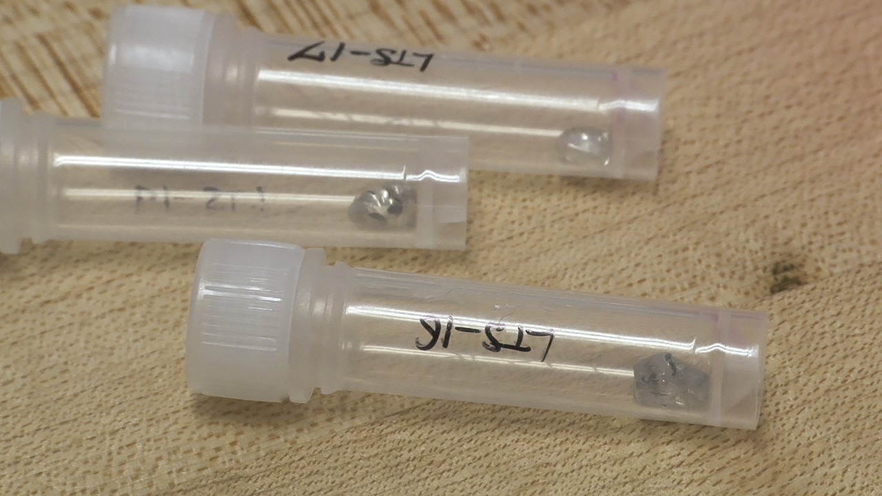 Next, Shirey has to painstakingly search the cylinder’s interior for the inclusion. It’s often tough to find among the shards of diamond and tiny metal fragments from the tungsten carbide components or the steel wall of the diamond cracker. “The inclusion is often 100–300 microns…sometimes it’s 50 microns,” Shirey says. (One centimeter = 10,000 microns, so even a 300-micron inclusion is only 0.03 centimeters across—just 0.3 of a millimeter!)