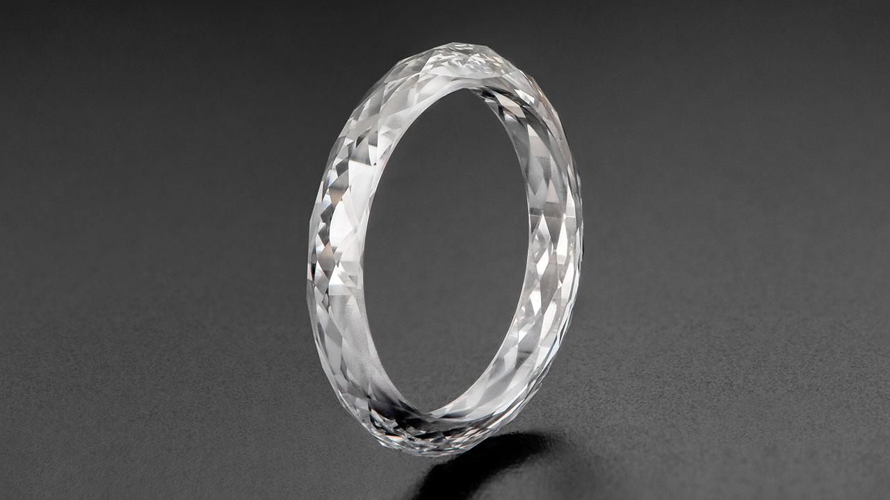 Carved single-crystal diamond rings are rare, with few examples to reference (see Spring 2020 Lab Notes, pp. 132–133). But with advancing technology in the laboratory-grown diamond industry, the creation of solid faceted diamond rings is now a reality. Recently submitted to the New York laboratory was a 4.04 ct single-crystal laboratory-grown diamond ring (figure 1). The 3.03 mm thick band had an inner diameter of 16.35–16.40 mm and an outer diameter of 20.32–20.40 mm. The ring was produced by Dutch Diamond Technologies in collaboration with the Belgian jewelry store Heursel, established in 1745.