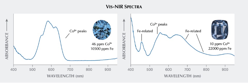 Vis-NIR spectra shows that the blue spinel on the left contains high amounts of cobalt, while the grayish blue spinel on the right contains high amounts of iron. The spinel on the left was classified as cobalt spinel, which is more valuable due to its vibrant blue color.