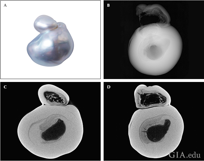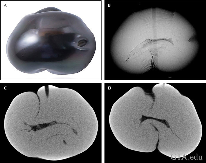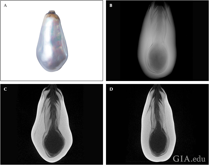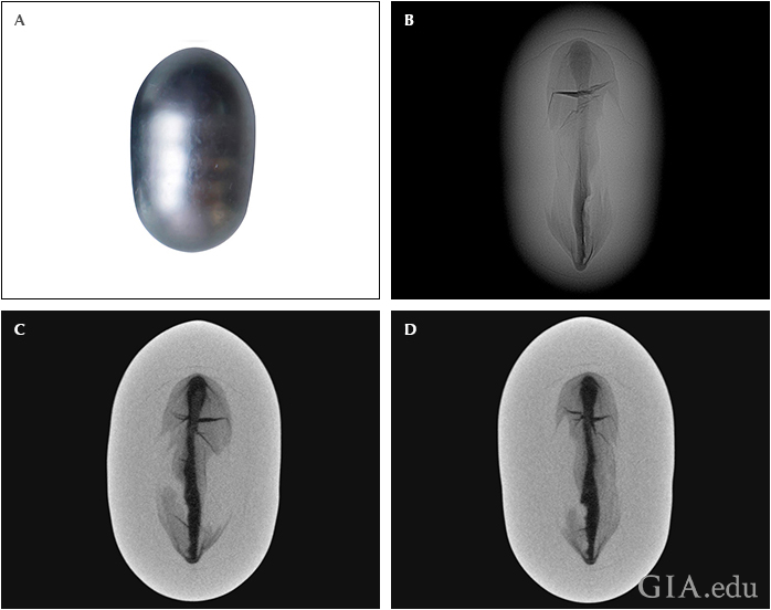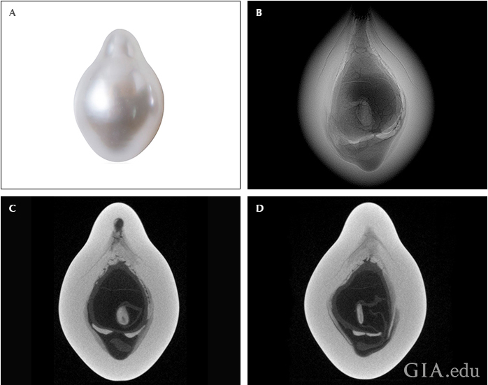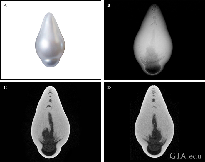 Pearl A-55 (figure 9) showed a fairly large void with some organic matter (a gray feature in the thicker lower area of the RTX image). The void extends upward toward the tapered end and narrows in the central area. Distinct growth arcs may be seen extending from the lower void feature and are also clearly seen following the pearl’s shape toward the tapered end. The structure of this pearl is not as convincing as the others in table 2, but its overall form and external appearance indicate it is more likely an NBC pearl than a natural pearl. GIA would interpret such a structure as NBC.