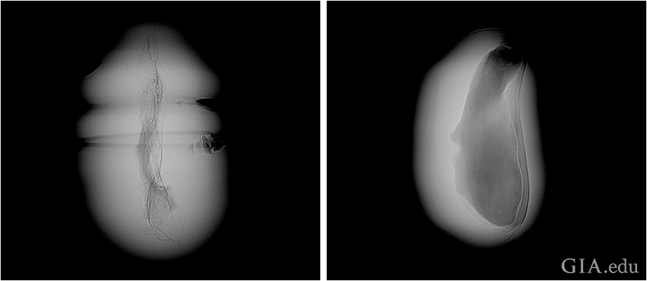 The microradiographic results of the pearls in Group B also revealed voids as their predominant features (table 1, right). However, some showed linear structures and others revealed structures that would be challenging to gemologists examining the pearls on a “blind” basis (submitted without any information on origin/history) under strict laboratory conditions. Pearls B-13 and B-21 (figure 12) are examples of the linear and void structures observed within two of the NBC pearls studies in the group, respectively.