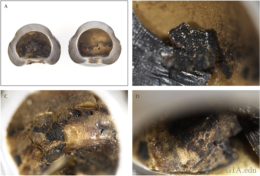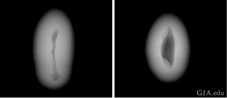 Pearl A-24 (figure 8) showed an elongated void structure with some short cracks branching out at one end of the pearl. An organic-rich “meaty” area surrounds the void feature. Cracks such as these may be observed in NBC and natural pearls, though there are some subtle differences.