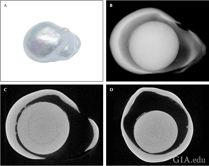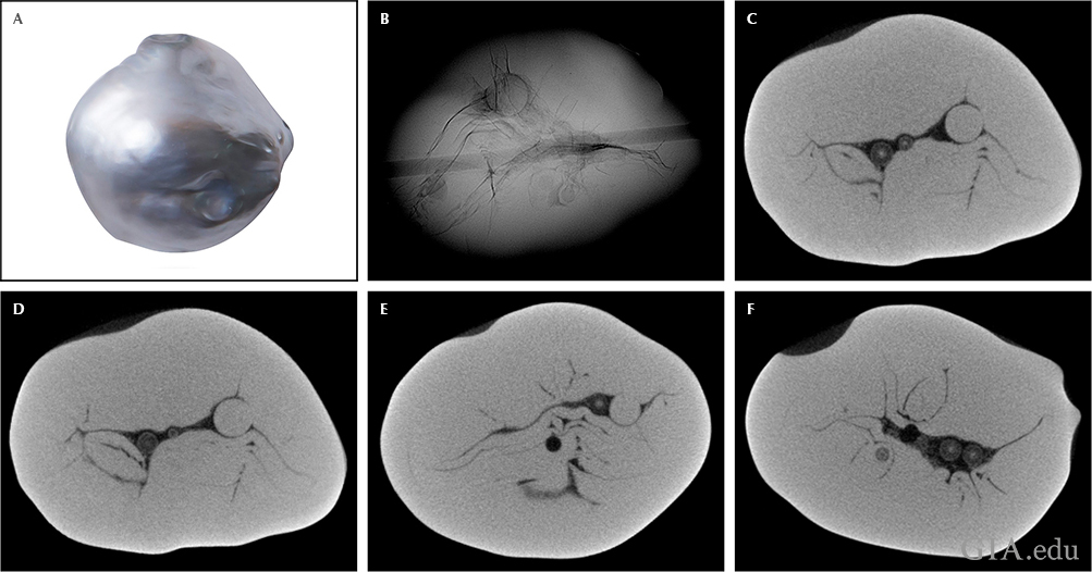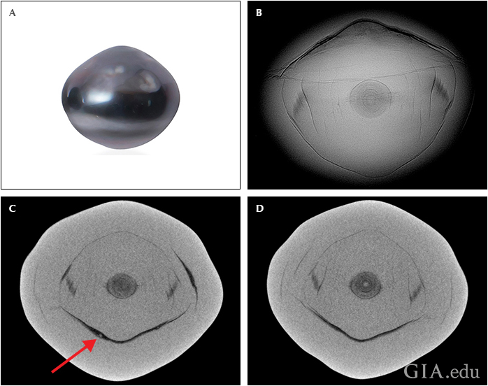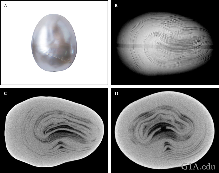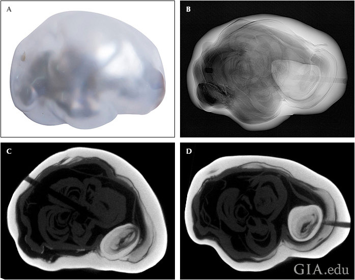 Pearl C-4 (figure 24) revealed the most challenging structure of the five largest pearls, although one that would likely be considered NBC by experienced pearl-testing gemologists. It consisted of a series of very clear concentric rings of an odd shape that formed around a central feature that resembled a void in some orientations and was less obvious in others. The µ-CT images showed the details more clearly, and the overall interpretation led us to believe that this was an NBC pearl with structure that could be somewhat misleading to some pearl testers with limited experience.