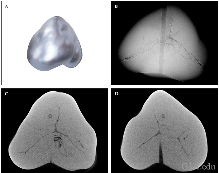 All the pearls were examined by real-time microradiography (RTX) to reveal their internal structures. As expected, most of them revealed void and/or “linear” features associated with organic-rich areas typical of most NBC pearls (Sturman, 2009). However, five BC pearls were found mixed with the samples, while some of the other samples revealed questionable or ambiguous structures that needed more detailed µ-CT analysis.