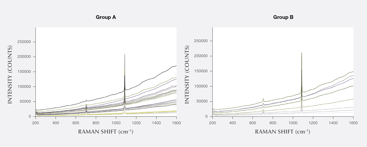 Twenty-seven (27) pearls of various colors were selected from Groups A and B and sorted by tone and color intensity (light to dark of various hues) in order to study the characteristic spectra of each type for reference and to make sure they were all naturally colored. The samples chosen from Group A (19 pearls) and Group B (8 pearls) were photographed to show their tones and hues/saturations (figure 5). Their ultraviolet and visible spectral features were recorded using an Agilent Cary 60 UV-Vis spectrophotometer with a custom-made GIA integrated sphere accessory incorporating an 80 Hz xenon flash lamp source. Spectra were recorded in the 200–800 nm range with a data interval set at 1.0 nm and a 1.5 nm fixed spectral bandwidth and scan rate of 184.62 nm/min. Raman and photoluminescence (PL) spectra were obtained using a Renishaw inVia reflex micro-Raman spectrometer system with a 514 nm argon-ion laser at 50 mW excitation. The laser was set at 100% power with three accumulations and an exposure time of 10 seconds. PL spectra were collected with the laser power set at 50% with one accumulation and an exposure time of 15 seconds.