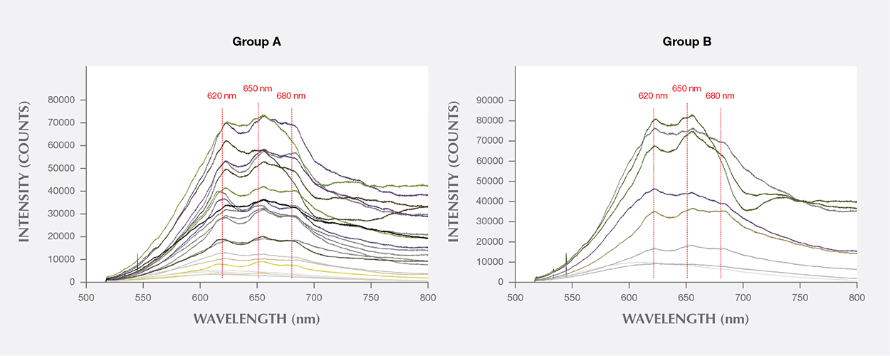 Likewise, the PL spectra obtained revealed that the lightest-color pearls, white to light gray, displayed smoother almost featureless spectra in the region of interest. The light brown and light yellow samples revealed weak features around 620, 650, and 680 nm similar to those observed in previous research on Tahitian pearls (Elen, 2002; Karampelas, 2011). The gray, brown, purplish gray, and purplish brown pearls showed clearer features around 620, 560, and 680 nm, while the darkest and most saturated pearls, dark gray to black, produced the most obvious spectral features (figure 28 and table 5), consistent with the results obtained for the UV-Vis and Raman spectra.