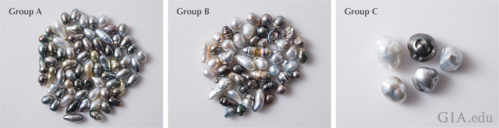 Pearls from Groups A and B measured between 7.68 × 7.32 × 5.68 mm and 16.25 × 7.84 × 7.64 mm and weighed from 0.59 to 6.49 ct, while those from Group C ranged from 16.40 × 14.38 × 14.11 mm to 18.40 × 16.95 × 13.80 mm and from 19.95 to 29.50 ct. The pearls were of various shapes and possessed a range of colors from silver to black. Some samples exhibited more than one color.