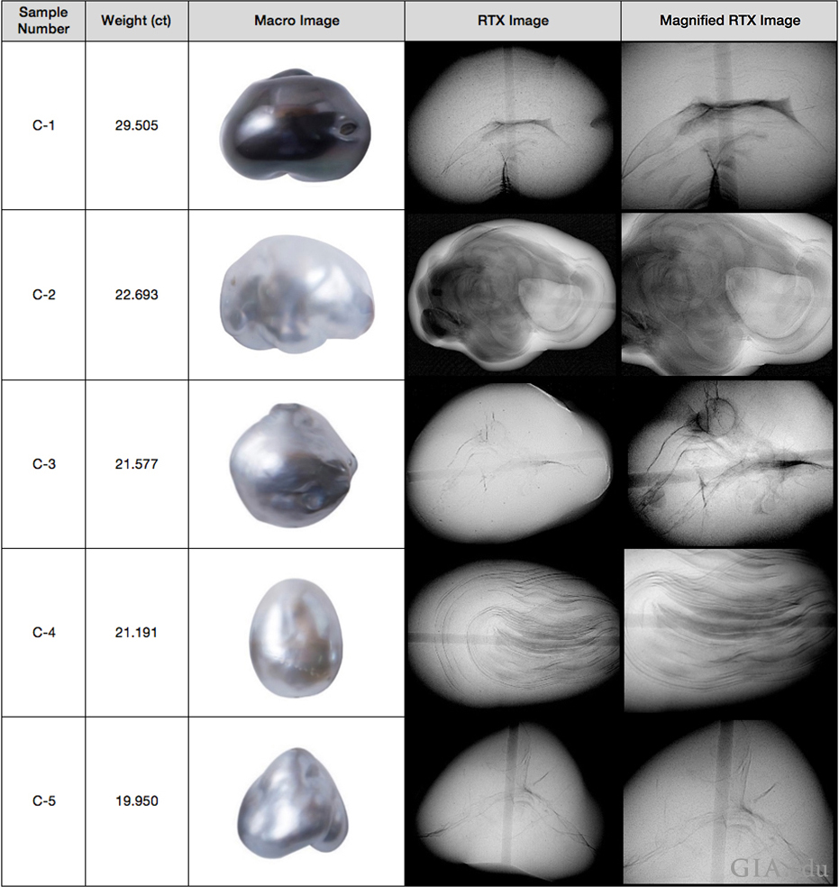 The five large pearls in the final group (Group C), were all examined by RTX and µ-CT analysis to reveal their internal structures. The RTX images and their weights are shown in table 4 and the pearls are presented in the order discussed below (C-1 to C-5). Although three of them showed characteristic NBC structures, the two remaining pearls revealed more intriguing features.