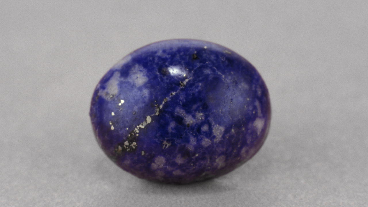 Lapis frequently contains varying amounts of whitish calcite matrix—the host rock that surrounds the gem—or flecks or veins of glinting yellow pyrite, or both. The gem can also have a smoothly uniform bodycolor, free of visible pyrite and calcite.